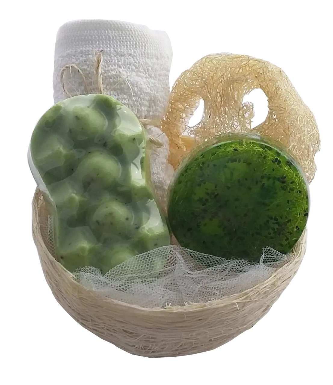 1 Canasta de ixtle natural1 rodaja de lufa1 lufa de corazón o redonda1 jabón artesanal 85-95gr1 jabón decorativo 55gr-60gr1 toalla facial 30*30cm envuelta en tela de tul