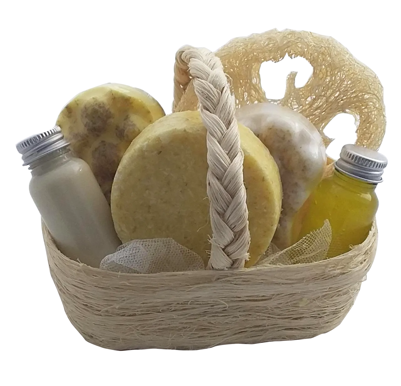1 Canasta de ixtle natural1 rodaja de lufa1 lufa de corazón o redonda2 jabones artesanales 85-95gr1 shampoo sólido 100gr2 amenidades 30ml envuelta en tela de tul