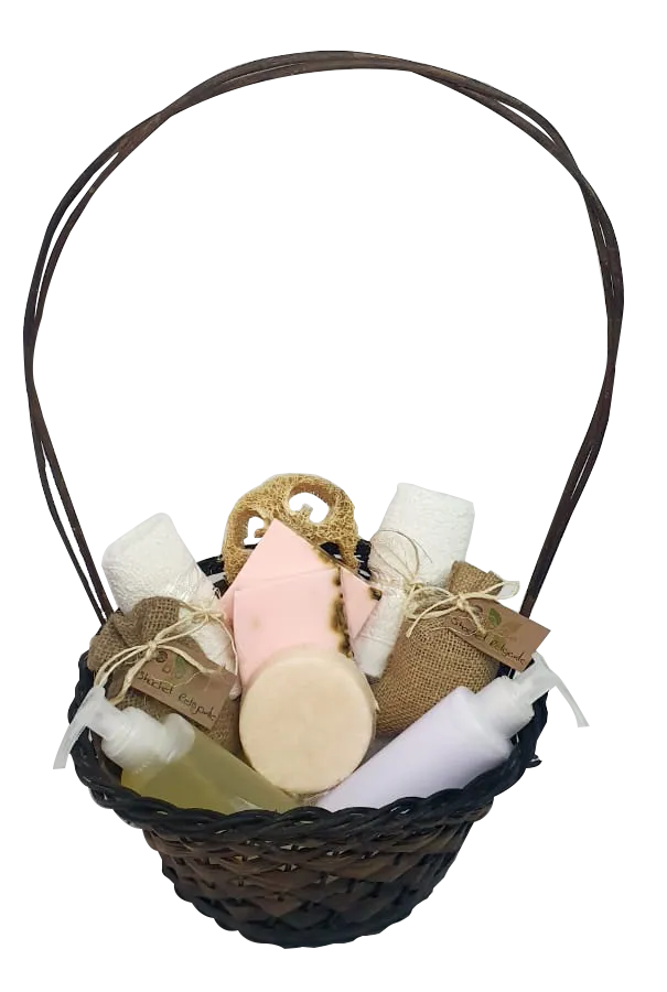 1 Canasta1 lufa circular corazón o rodaja2 sachets1 toalla fácil de 30*30cm 2 jabones artesanales de 100gr1 shampoo sólido de 100gr11 crema líquida de 125ml11 Aceite para masaje 125ml