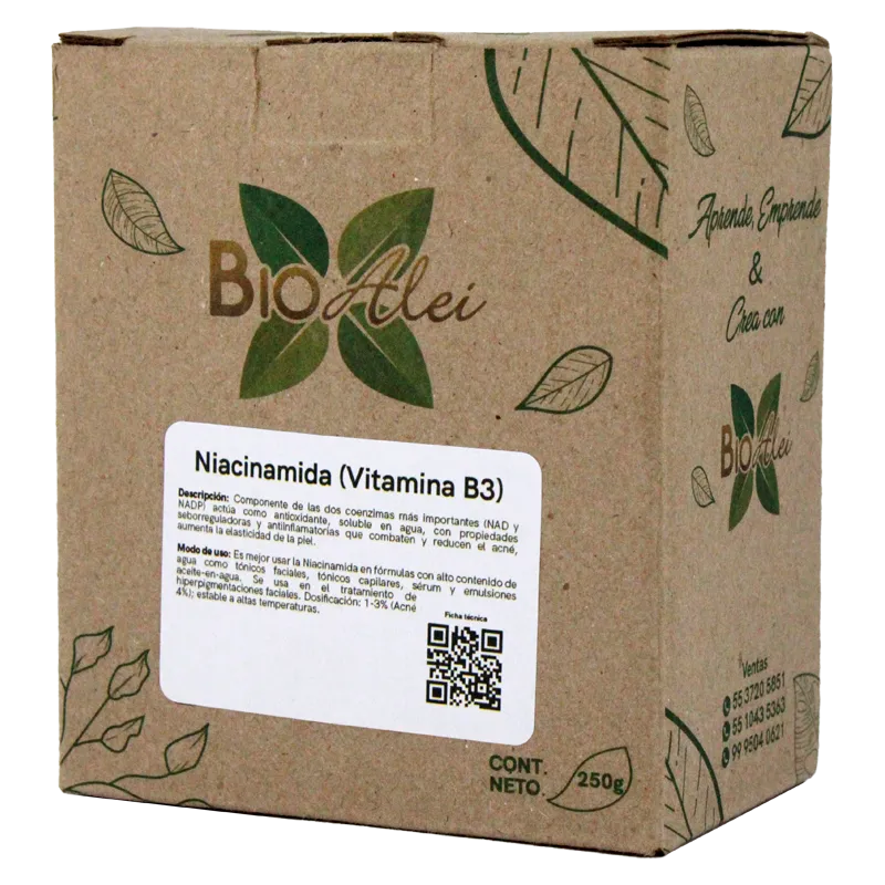 Componente de las dos coenzimas más importantes (NAD y NADP) actúa como antioxidante, soluble en agua, con propiedades seborreguladoras y antiinflamatorias que combaten y reducen el acné, aumenta la elasticidad de la piel.