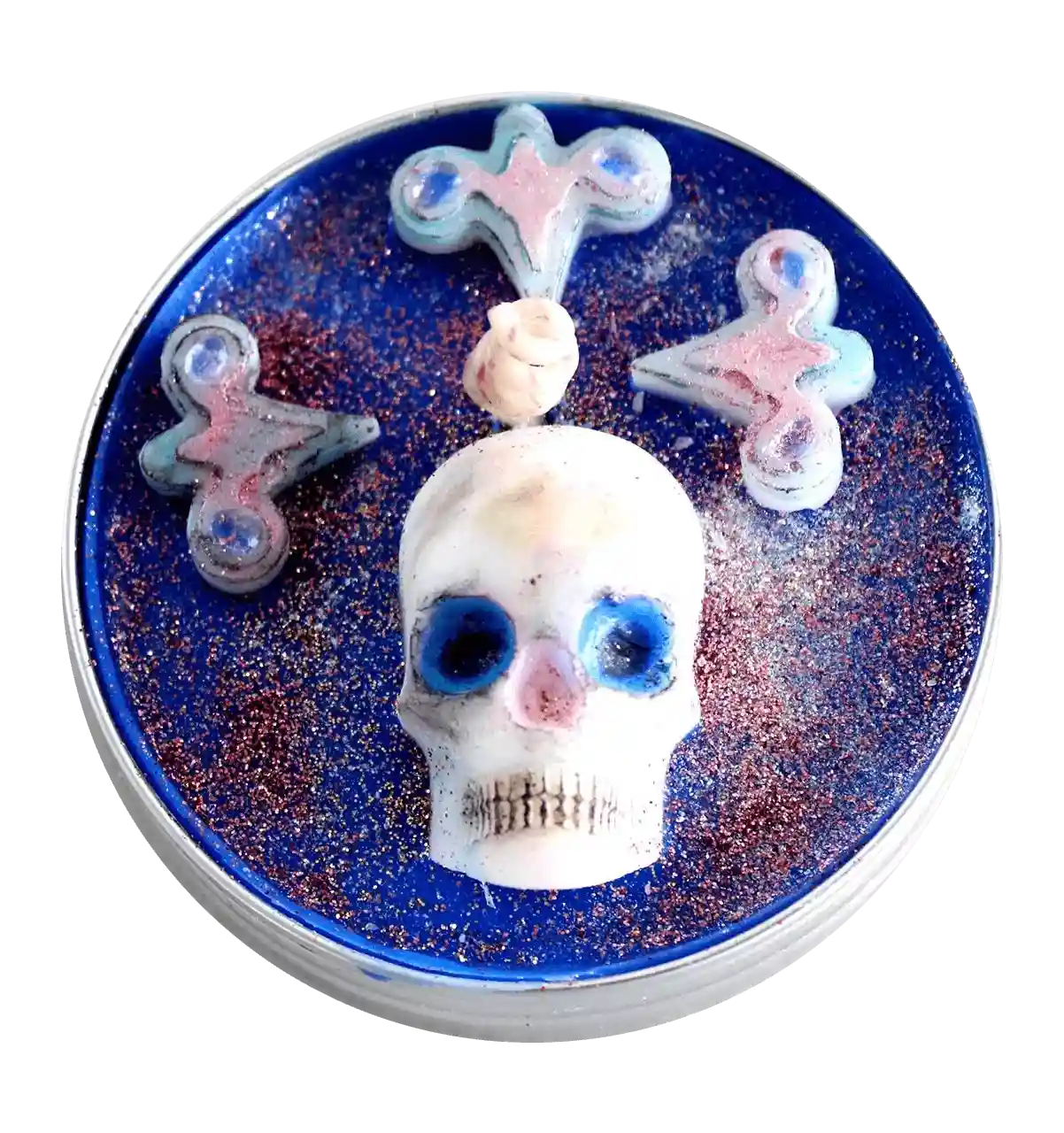 Vela artesanal decorativa con parafina malasia, parafina china, mica azul, mica rosa perla, mica oro perlado, glitter rosa, glitter perlado, glitter azul, molde de silicón calavera 3D, molde fondant silicón y pomadera aluminio 100g.